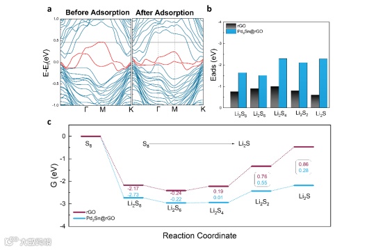 密度泛函理论(DFT)计算,验证了所合成的Pd₃Sn@rGO复合材料对LiPSs的吸附能力显著强于纯rGO。Pd₃Sn的拓扑表面态在吸附过程中促进了Li₂S₆的电子接收,从而增强了吸附并加速了氧化还原反应。Pd₃Sn的TSS与Li₂S有强相互作用,并能促进多硫化物的双向转化。活化能分析结果进一步证实了Pd₃Sn电催化剂能显著降低固固反应能垒,加速硫还原过程。