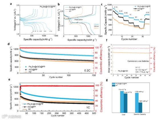 图5. Pd3Sn@rGO电池充放电和循环性能。
