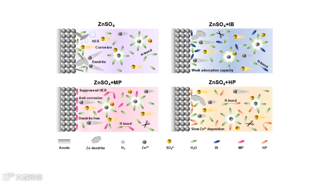 图1. IB、MP和HP分子对电解质及界面化学影响的示意图。