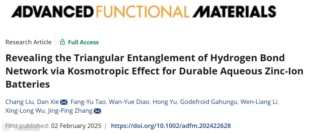 近日,来自东北师范大学的谢丹和张景萍教授在国际知名期刊Advanced Functional Materials上发表题为“Revealing the Triangular Entanglement of Hydrogen Bond Network via Kosmotropic Effect for Durable Aqueous Zinc-ion Batteries”的研究工作。该研究中选择了三种具有相同碳骨架但不同羟基官能团的添加剂(异丁醇(IB)、2-甲基-1,3-丙二醇(MP)和2-羟甲基-1,3-丙二醇(HP))引入到ZnSO4电解质中,以调节溶液环境中的氢键网络,并阐明电解质结构与AZIBs性能之间的内在关联。与IB和HP分子相比,具有足够极性官能团和适中空间位阻效应的MP分子不仅能够构建均匀且亲锌的EEI以抑制锌枝晶,还能通过其亲液效应改变Zn2+的配位环境并加强水分子的氢键网络,从而抑制副反应的发生。