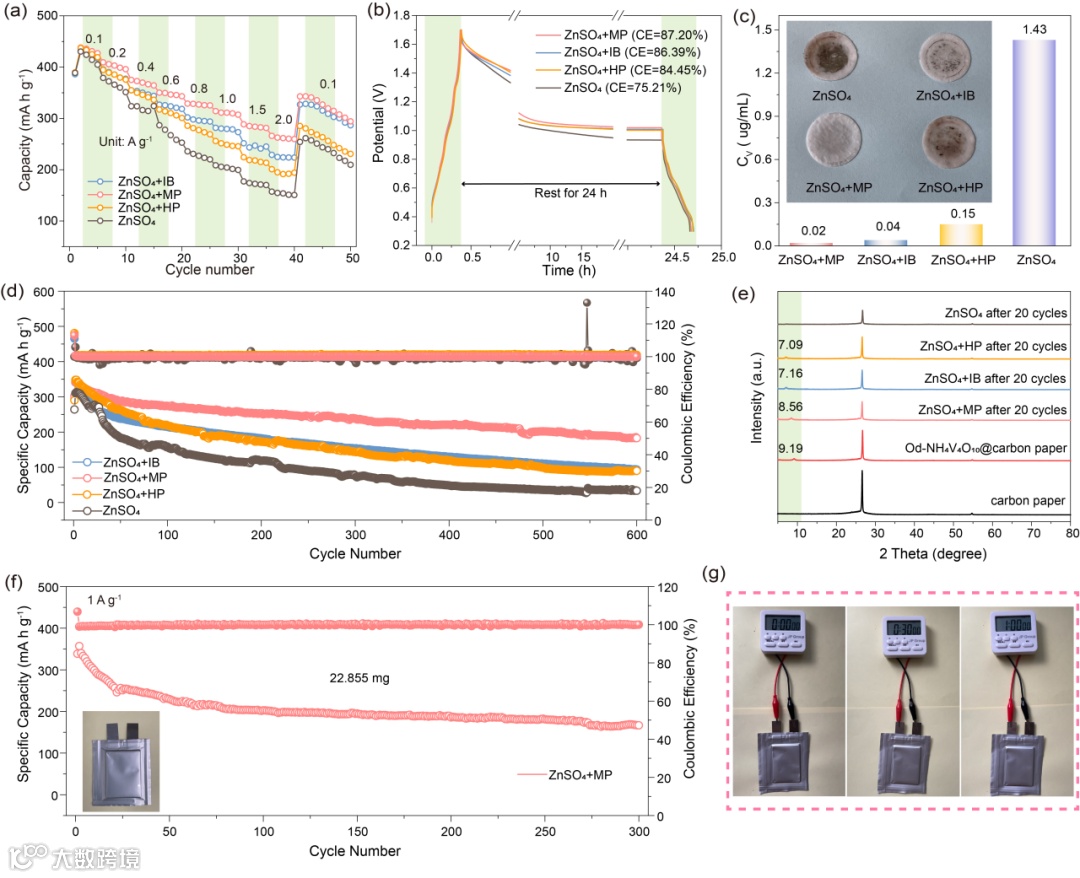 总之,本研究向ZnSO4电解质中分别引入了三种具有相同碳骨架和不同羟基官能团的醇类添加剂,以研究氢键网络、溶剂化结构和EEI对AZIBs性能的影响。结合实验和理论计算可以发现,当添加剂(IB)中的羟基数量较少时,对电解质中氢键网络的调节有限,这不利于抑制水的活性,几乎无法阻止副反应的发生。当添加剂分子(HP)中的羟基数量较多时,会阻碍Zn2+在EEI处的传输,增加成核障碍并导致Zn2+沉积不均匀,从而引发“尖端效应”。幸运的是,通过向电解质中引入具有适当羟基数量的添加剂(MP),可以有效解决与副反应和枝晶生长相关的这些问题。具体而言,由于MP分子具有强亲液效应,它可以打破水分子之间原有的氢键网络,生成强而稳定的氢键网络,最大限度地限制H3O+在EEI处的质子转移,并抑制EEI处由水引发的副反应。同时,得益于适中的空间位阻效应,MP分子易于进入Zn2+的第一溶剂化结构,进一步提高了对副反应和枝晶生长的抑制效果。此外,MP分子通过同向羟基官能团的协同作用在ZMA表面上的特异性吸附促进了锌的均匀沉积,有效防止了锌枝晶的形成。因此,在ZnSO4+MP电解质中的Zn||Zn对称电池表现出显著的稳定性,在0.5 mA cm-2和0.5 mAh cm-2条件下循环寿命超过3000小时。组装的Zn||Cu不对称电池在1 mA cm-2和1 mAh cm-2条件下循环1000次后的平均库仑效率为99.41%。更重要的是,含有MP添加剂的Zn||Od-NH4V4O10和Zn||AC全电池表现出优异的倍率性能和令人满意的放电比容量。本工作验证了从调节电解质中氢键网络的角度来看,平衡添加剂中官能团数量是调节水活性和Zn2+在电解质中均匀沉积的有效方法。