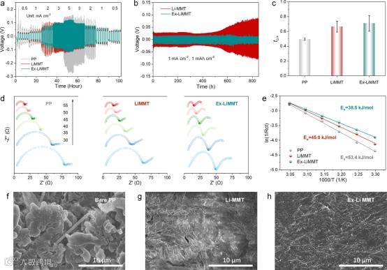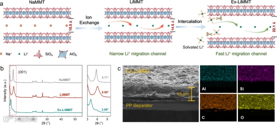 2. 层间扩展的蒙脱石(Ex-LiMMT)具有有序的二维Li+扩散通道,表现出比未扩层LiMMT更高迁移数和优良的Li+电导率,从而实现了均匀的锂沉积,避免锂枝晶的形成。