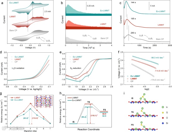 3. 具有亲锂性的Ex-LiMMT能够促进Li+的脱溶剂化过程,并对多硫化物具有适度的吸附能力,有效抑制多硫化物的穿梭。同时,结合促进的Li+扩散行为,增强了硫物种的氧化还原反应动力学。
