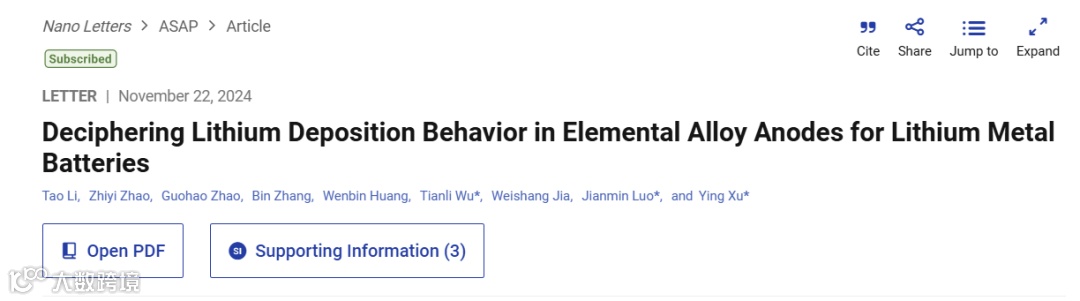 兰州大学徐英青年研究员、浙江工业大学罗建敏教授、河南大学吴天利副教授 Nano Letters:锂金属电池合金基底上锂沉积行为解读
