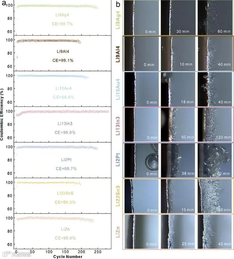 图 5(a)1 mA cm−2电流密度和1 mAh cm−2容量下,具有各种锂合金电极的锂箔半电池的库仑效率。(b)2 mA cm−2电流密度下不同时间点在不同基底上锂沉积的原位光学显微照片。