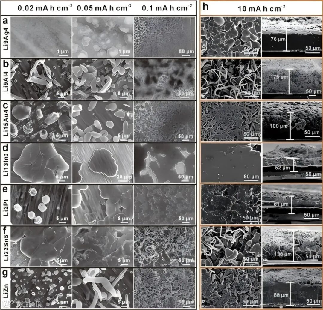 图 2 0.01 mA cm−2电流密度下锂沉积的SEM图像,沉积物位于(a)Li9Ag4、(b)Li9Al4、(c)Li15Au4、(d)Li13In3、(e)Li2Pt、(f)Li22Sn5、(g)LiZn 合金基板上,容量分别为0.02、0.05 和0.1 mAh cm−2;以及(h)在1 mA cm−2沉积电流密度下,在相应的锂合金基底上具有10 mAh cm−2容量。