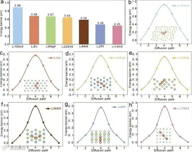 图 3(a)锂在不同锂合金基底上的扩散能垒,以及锂吸附原子在(a)Li9Ag4、(b)Li9Al4、(c)Li15Au4、(d)Li13In3、(e)Li2Pt、(f)Li22Sn5、(g)LiZn 表面上的详细扩散能垒和路径。