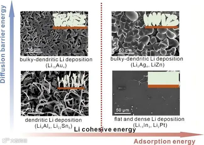综合分析锂的吸附能、扩散能垒、锂的结合能以及锂的形貌演变,锂在锂合金基底上的沉积与其热力学/动力学性质的相关性如下(图4):
