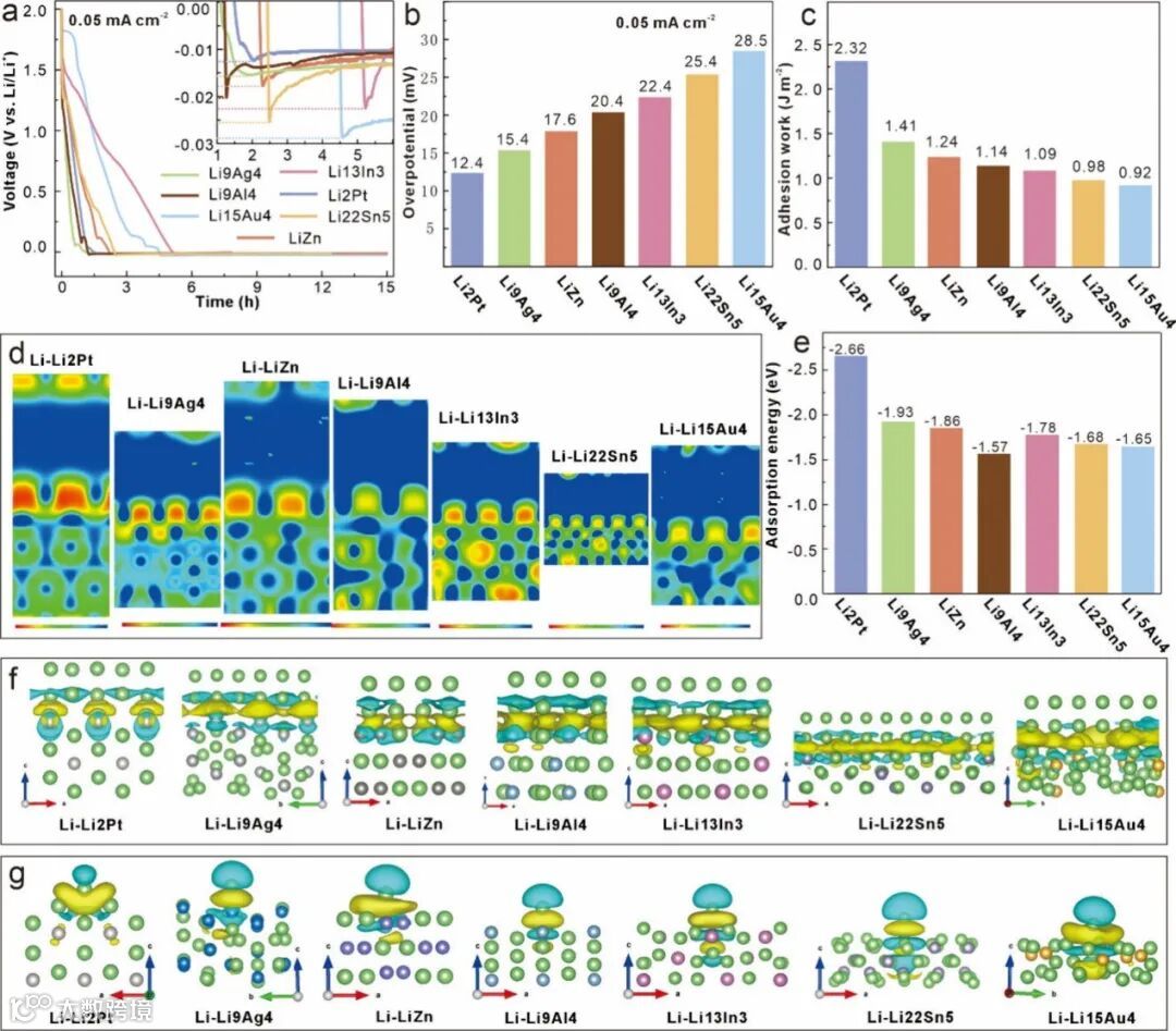 总体而言,在锂合金基底上锂沉积的成核势垒顺序为Li2Pt < Li9Ag4 < LiZn < Li9Al4 < Li13In3 < Li22Sn5 < Li15Au4。然后,采用密度泛函理论计算,从热力学和动力学角度描述锂的沉积(图 1 c-1 g)。锂的沉积不仅仅是锂原子在基底上的吸附,它应该是界面的改变,其中晶格失配也是造成沉积的原因。粘附功表示分离异质界面所需的能量,涉及晶格失配和界面键强度,为锂的沉积提供了更全面的描述。如图1c所示,锂在锂合金基底上的粘附功顺序为