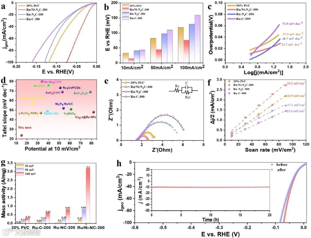 在1.0 M KOH电解液中,我们评估了Ru/Ni-N4C-300催化剂在HER中的性能,并与多种对照催化剂进行了比较。如图3a所示,线性扫描伏安法(LVS)曲线表明,Ru/Ni-N4C-300催化剂在所测电位范围内的电流密度为所有催化剂中最高。该催化剂在10 mA/cm²的基准电流密度下展现出优异的HER活性,超低的过电位为15.0 mV,显著低于20% Pt/C(33.0 mV)和Ru-N4C-300(43.2 mV) (图3b)。如图3c所示,Ru/Ni-N4C-300催化剂的塔费尔斜率为23.7 mV dec⁻¹,明显低于20% Pt/C (37.9 mV dec⁻¹),表明其氢气析出反应动力学较快,符合Volmer-Tafel机理。相比之下,不含单原子Ni的对照催化剂(Ru-C-300,72.9 mV dec⁻¹;Ru-N4C-300,48.7 mV dec⁻¹)具有明显较高的塔费尔斜率,进一步确认了单原子Ni对Ru纳米团簇在HER反应中的重要影响。值得注意的是,Ru/Ni-N4C-300催化剂的η10和塔费尔斜率均优于其他Ru基催化剂。