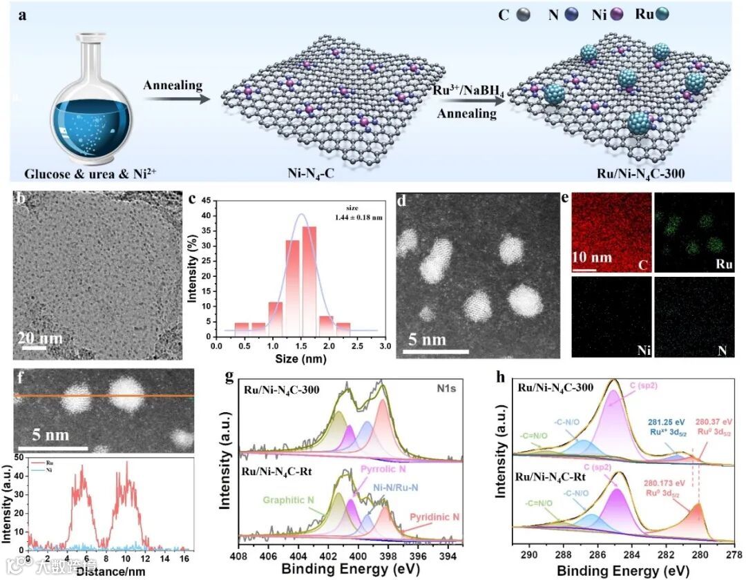 单原子Ni-N4 位点调控Ru纳米团簇结构增强