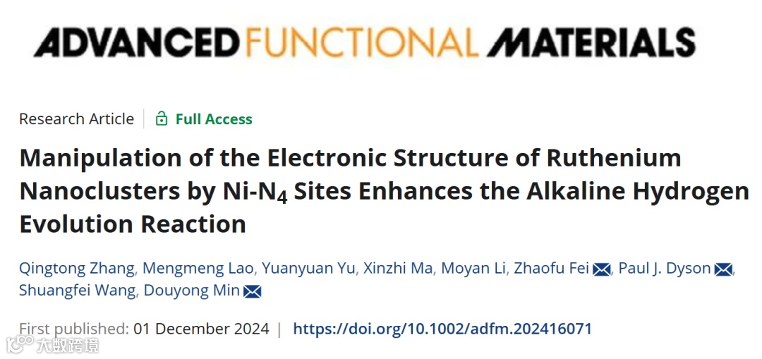 今日,来自广西大学王双飞院士团队闵斗勇教授和瑞士洛桑联邦理工学院(EPFL)Paul Dyson教授、费兆福教授合作,在国际知名期刊《Advanced Functional Materials》上发表题为“Manipulation of the Electronic Structure of Ruthenium Nanoclusters by Ni-N4 Sites Enhances the Alkaline Hydrogen Evolution Reaction”的论文观点。该论文第一作者为广西大学张清桐博士。该研究性论文主要探究了单原子Ni增强Ru纳米团簇碱性HER活性的作用机制。