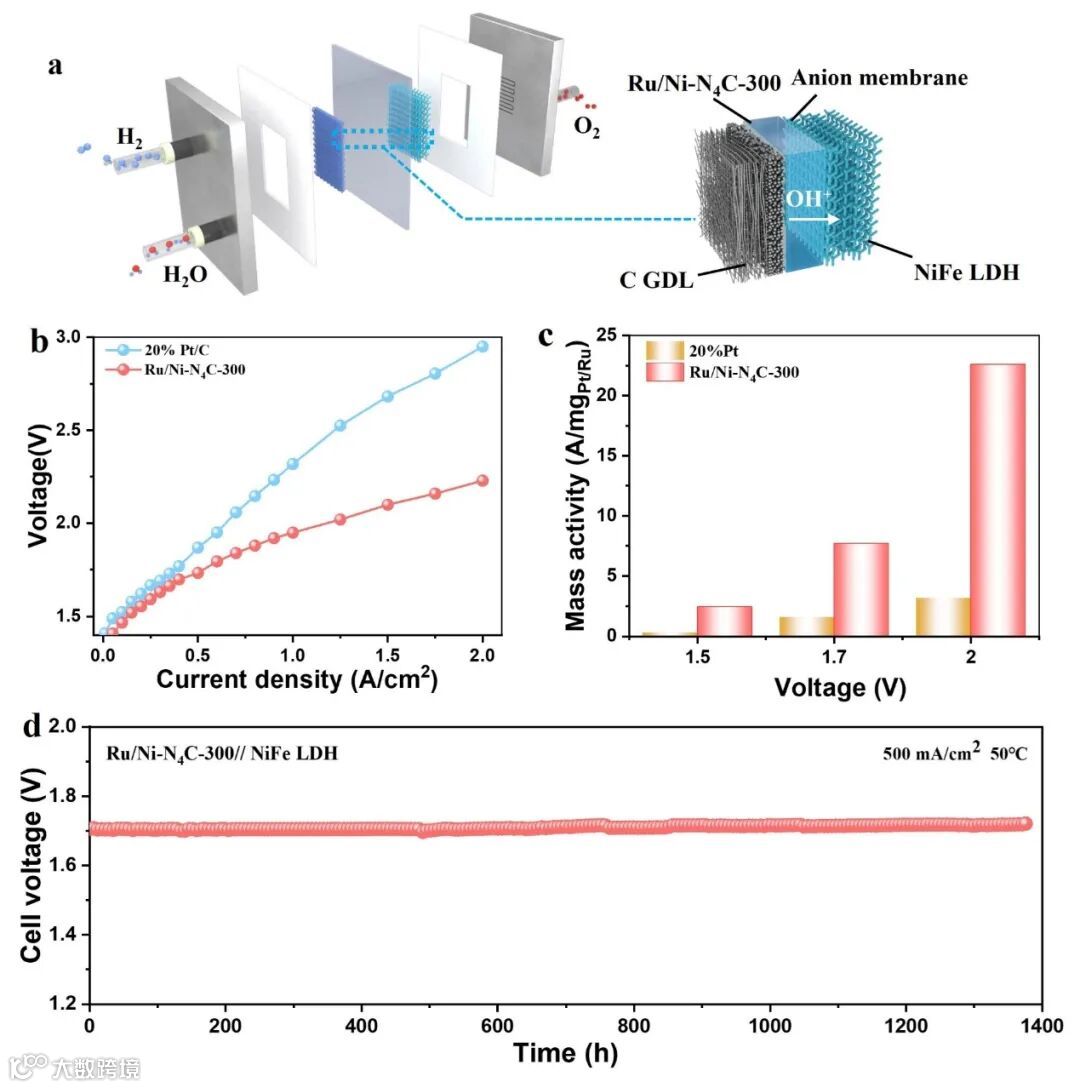 为了评估Ru/Ni-N4C-300催化剂在工业规模氢气生产中的应用潜力,组装了一个基于膜电极组件(MEA)的阴离子交换膜水电解槽(AEMWE),其中Ru/Ni-N4C-300催化剂作为阴极,自制的NiFe双层氢氧化物(NiFe LDH)作为阳极(图4a)。以Ru/Ni-N4C-300催化剂为基础的AEMWE在性能上优于使用20% Pt/C组装的电解槽(图4b)。如图4b所示,AEMWE(Ru/Ni-N4C-300 ‖ NiFe LDH)在500 mA/cm²的工业电流密度下,电池电压仅为1.72 V,优于使用20% Pt/C ‖ NiFe LDH的配置(1.87 V@500 mA/cm²)。此外,Ru/Ni-N4C-300催化剂基础的AEMWE在1.5、1.7和2.0 V下的质量活性分别为2.46、7.70和22.60 A/mgRu,是20% Pt/C的约八倍(图4c)。AEMWE(Ru/Ni-N4C-300 ‖ NiFe LDH)在工业条件下(1.0 M KOH,50℃)展现了卓越的稳定性,在500 mA/cm²下运行超过1370小时,几乎没有性能衰退。