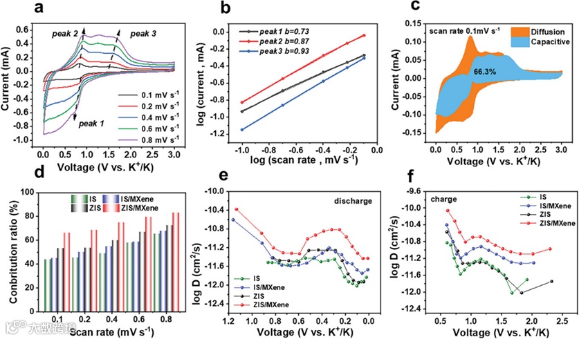 通过对ZIS/MXene进行CV、GITT等动力学分析,发现ZIS/MXene的b值接近1.0(见图4b),这一结果表明其表面反应过程占据了主导地位。此外,为了深入探究ZIS/MXene的电荷存储机制,进行了不同扫描速率下的CV测试,观察到其电荷存储主要通过赝电容贡献。ZIS/MXene展现出最高的K+扩散系数(见图4e,f),显示出其在动力学性能上的优越性。