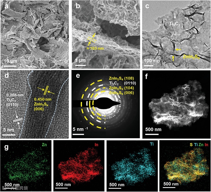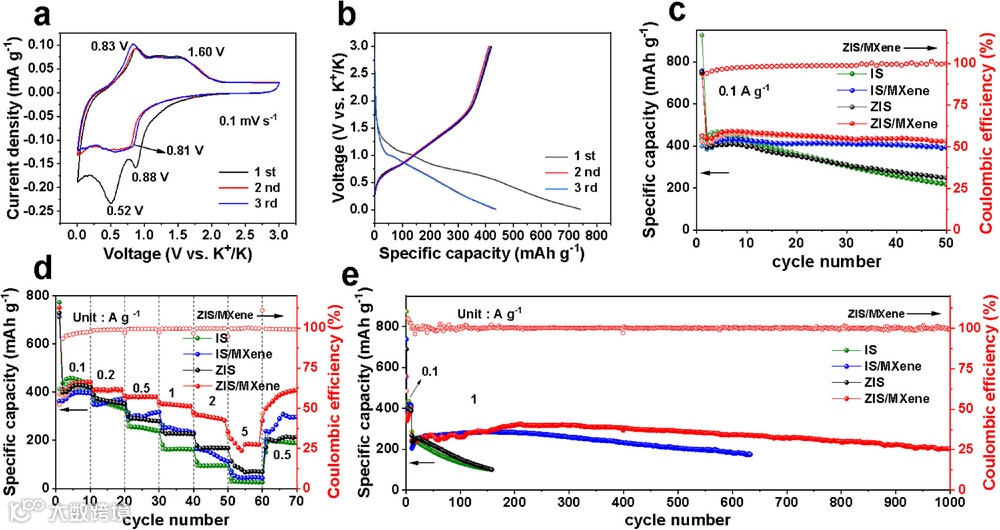 文章通过扫描电子显微镜(SEM)观察显示ZIS/MXene纳米片的厚度约为193 nm(见图2b),而透射电子显微镜(TEM)进一步证实了ZIS与MXene之间的紧密结合。这种结构设计不仅促进了K+和电子的快速传输,而且能够有效适应充放电过程中的体积变化,维持了电极结构的长期循环的稳定性。