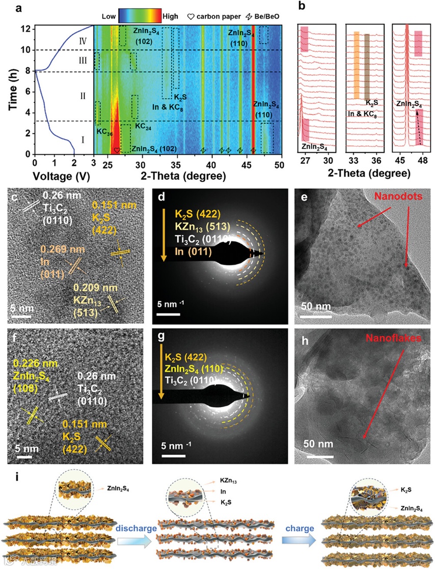 原位XRD结果(见图6a,b)揭示了ZIS/MXene负极是插层-转换-合金化反应机制的工作过程。在放电初期,ZnIn2S4的特征峰向低角度偏移,表明K+的插层发生,形成了KxZnIn2S4。随着放电的继续,KxZnIn2S4的峰消失,同时出现了归属于K2S和In的新峰,这表明发生了转换反应,生成了K2S和In。此外,KZn13的形成揭示了Zn与K之间发生了合金化反应。在充电过程中,随着充电电位的增加,ZnIn2S4的峰重新出现,显示出高度可逆的转换反应特征。非原位TEM表征进一步分析了ZIS/MXene的电化学反应。在完全嵌钾后(见图6c-e),原本的纳米片结构转变为由K2S、KZn13和In组成的纳米点结构,这证实了转化反应的发生。而在完全脱钾后(见图6f-h),由于K+的脱离,材料恢复到ZIS/MXene的原始纳米片形貌。这种形貌的可逆变化显示了ZIS/MXene出色的循环稳定性。