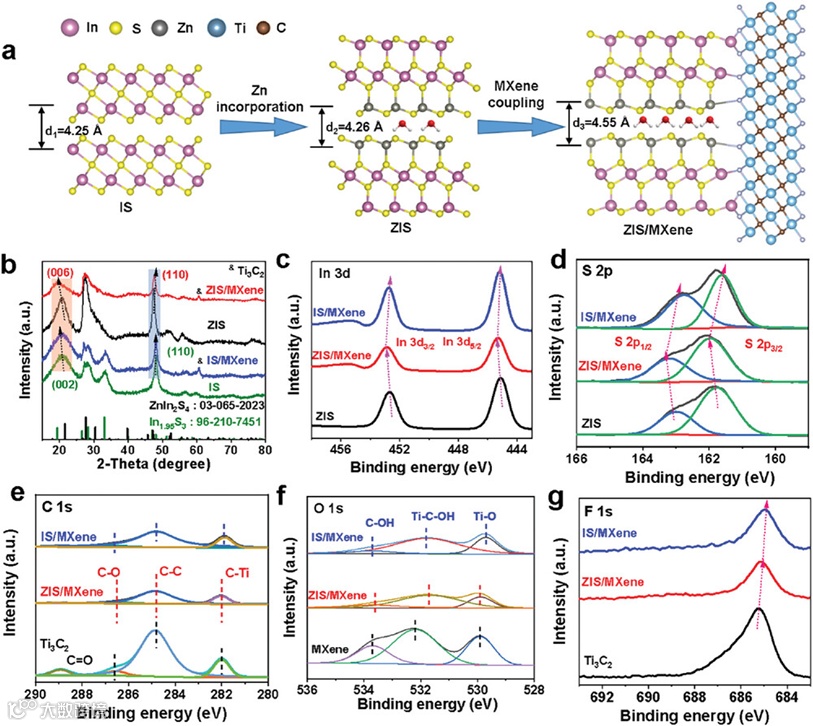 文章首先分析了锌取代和MXene耦合对二维层状结构层间距的影响(见图1a),发现锌的引入有效增大了层间距,而MXene的结合进一步扩展了这一间距。此外,水分子和甘油分子的插层作用也促进了层间距的扩大,为钾离子(K+)的快速迁移创造了有利条件。通过XRD和XPS测试对ZIS、IS/MXene和ZIS/MXene三种样品进行了详细的成分分析,证实了锌取代和MXene耦合的策略是可行的,并且XRD与XPS结果相互印证,确认了ZIS与MXene之间形成了稳定的异质界面。