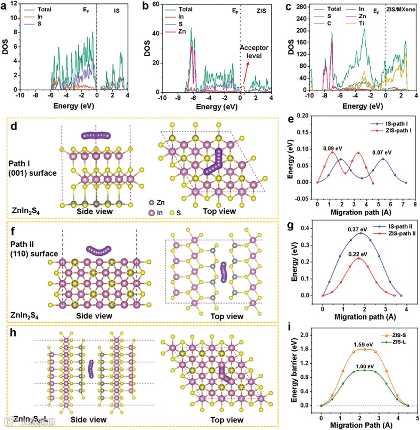 通过密度泛函理论(DFT)计算,本研究深入分析了锌掺杂和MXene耦合对ZIS/MXene电化学动力学的影响。计算结果表明,ZIS/MXene在费米能级(EF)附近具有较高的态密度(DOS),这增强了其电子导电性和反应性(见图5c)。这一发现意味着ZIS/MXene材料具有更高的电子传输效率和更活跃的电化学行为。此外,DFT计算还评估了ZnIn2S4在(001)和(110)两个晶面上的K+扩散能垒,结果显示锌取代后的ZIS/MXene在这两个晶面上均展现出更低的K+扩散能垒(见图5d,g),这有利于K+的快速扩散,从而从理论上验证了锌取代对增强K+扩散动力学的积极作用。为了进一步探究MXene耦合对K+扩散动力学的影响,研究者们构建了具有不同层间距的两层ZnIn2S4模型(图5h,i),模拟了ZIS和ZIS/MXene中的K+扩散过程。计算发现,ZIS-S的K+扩散能垒为1.59 eV,而层间距更大的ZIS-L模型的K+扩散能垒降低至1.00 eV,这一结果表明MXene耦合引起的层间扩张显著增强了K+的扩散动力学。DFT计算分析不仅揭示了锌取代和MXene耦合对提升ZIS/MXene电化学性能的重要作用,而且为设计具有更优电化学动力学特性的钾离子电池材料提供了理论依据。