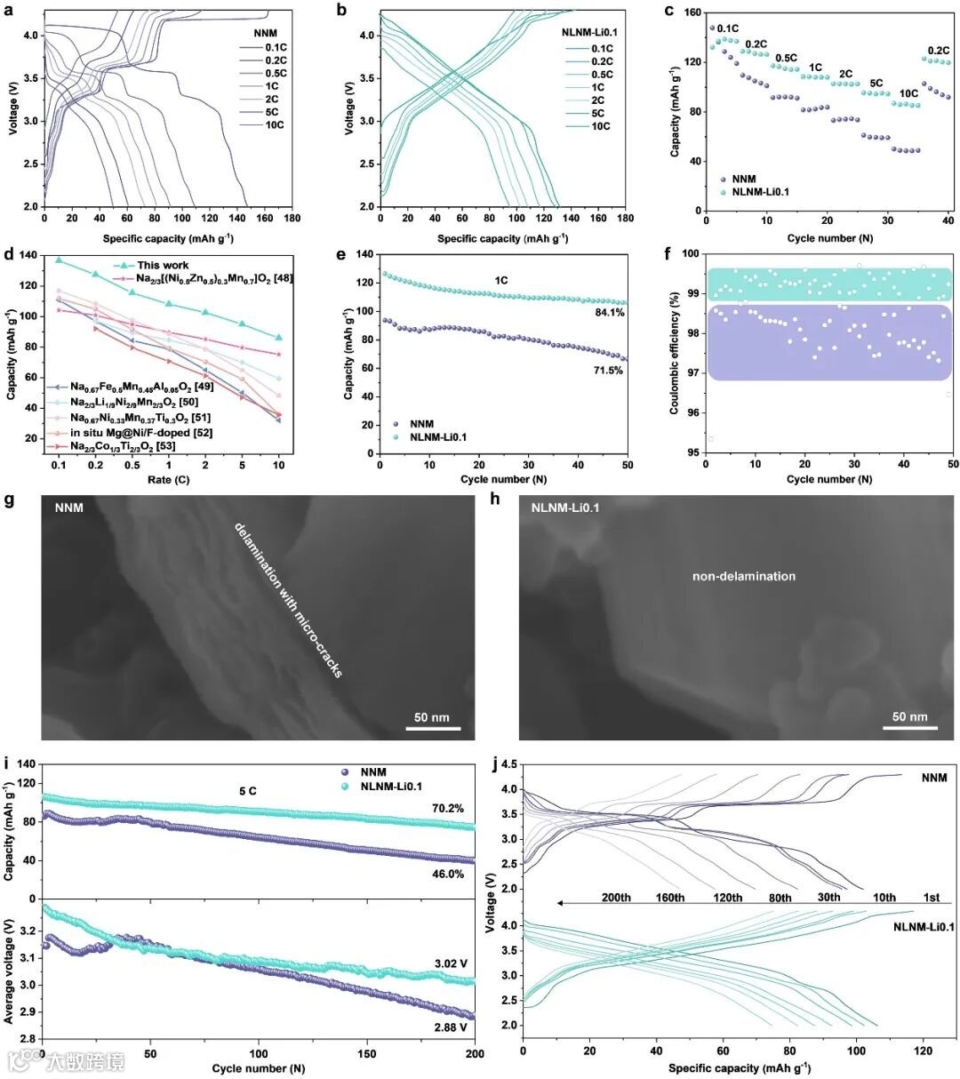 图4. (a, b) NNM和NLNM-Li0.1正极从0.1 C到10 C不同倍率下的初始GCD曲线,(c, d) NLNM-Li0.1正极的倍率性能与NNM和已报道的正极进行了比较,(e , f) NNM和NLNM-Li0.1正极的循环性能(容量保持率和库仑效率)和(g, h) 在1 C下循环50次后的高倍率SEM图像,(i j)进一步比较了两种正极在5 C下200次循环期间给定循环下的容量和电压保持率与GCD曲线。