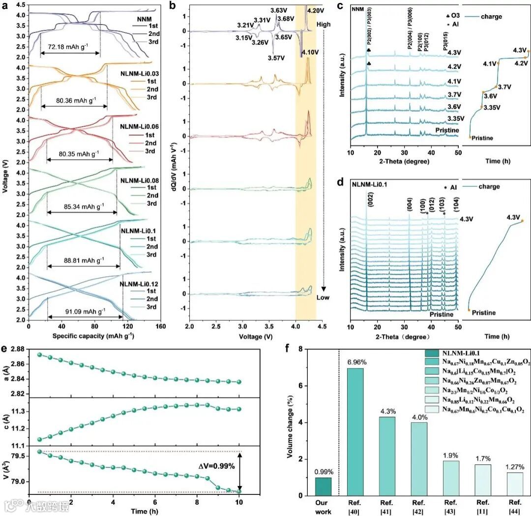 图2. (a) NNM和NLNM正极在0.1 C下前三个循环的GCD曲线和(b)相应的dQ/dV ( Q :容量; V :电压)曲线,(c) NNM正极在给定电压下的XRD图谱和(d) NLNM - Li0.1正极在2.0 V到4.3 V充电过程中的原位XRD图谱,(e) NLNM - Li0.1正极的晶格参数演变和(f)与已报道的镍锰-基正极材料的体积变化比较。