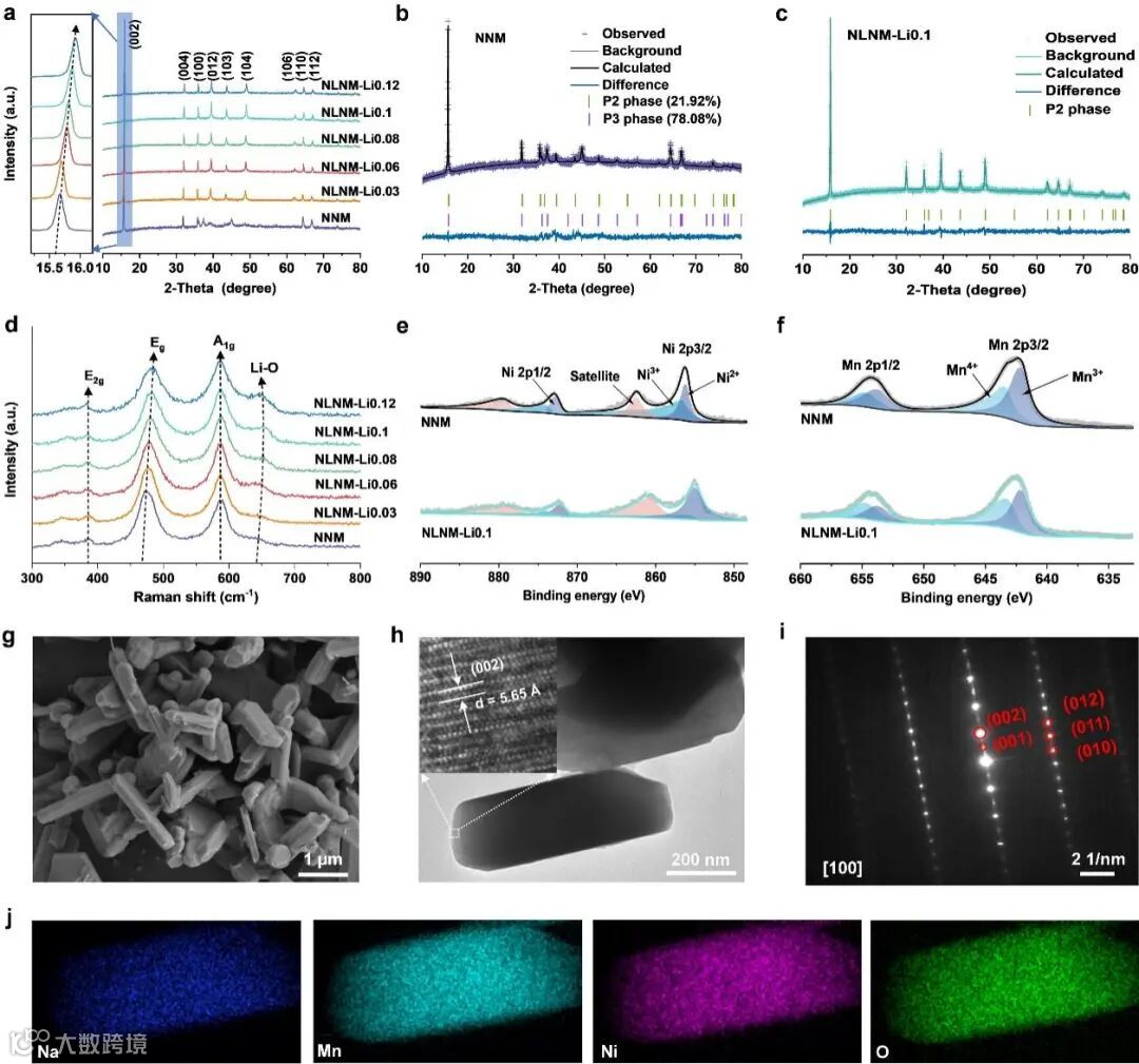 图1 .所制样品的(a, d)XRD图和拉曼光谱,(b、c、e、f)NNM和NLNM - Li0.1样品的XRD Rietveld精修图谱、Ni 2p和Mn 2p的高分辨XPS图谱,(g-j) NLNM-Li0.1样品的SEM图、TEM图、SAED图和元素图。