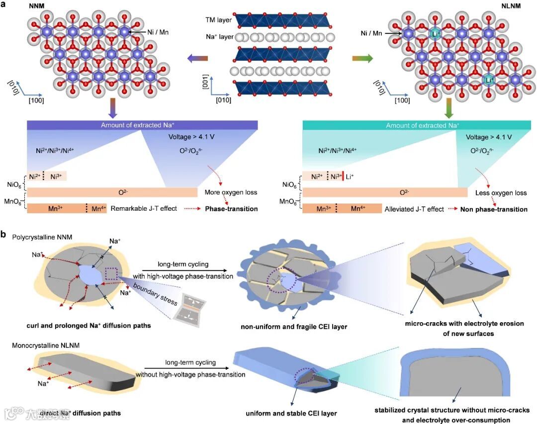图5 .电荷补偿调节机制和晶体生长优化的图解协同强化策略用于稳定SIBs的NLNM正极,(a) 具有相变正极的NNM正极材料和无相变的NLNM正极的晶体结构和电荷补偿对比,(b) 多晶NNM正极和单晶NLNM正极的Na+扩散路径和结构稳定性的比较。