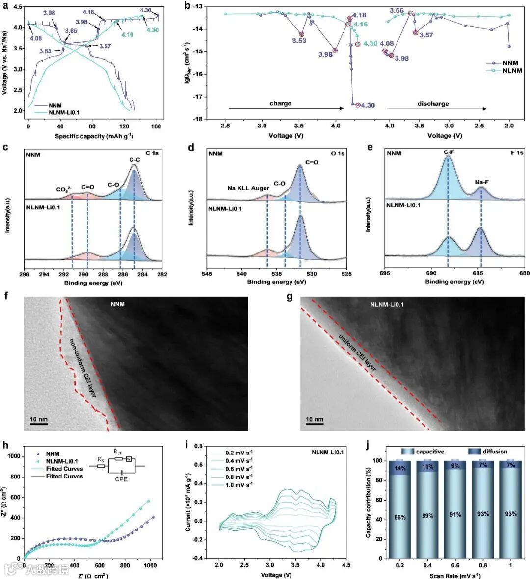 图3. NNM和NLNM-Li0.1正极的(a, b) GITT曲线和DNa+,(c-e) 循环10圈后C1s、O1s和F1s的高分辨XPS谱图,(f , g)TEM图像、(h) EIS图和(i, j) 在0.1~1 m V s-1的不同扫速下,NLNM-Li0.1正极的CV曲线和赝电容贡献。