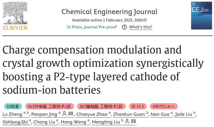 Lu Zheng, Panpan Jing*, Chaoyue Zhao, Zhaokun Guan, Nan Guo, Jiale Liu, Yunlong Shi, Chang Liu, Hong Wang, Mengting Liu*. Charge compensation modulation and crystal growth optimization synergistically boosting a P2-type layered cathode of sodium-ion batteries
