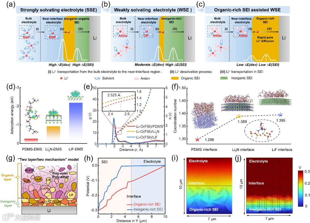 图1. SEI组成与界面传输动力学的构效关系。(a)强溶剂化电解质(SSE)、(b)弱溶剂化电解质(WSE)和(c)富有机SEI辅助WSE的电荷传输过程示意图。(d)不同SEI组分对溶剂的吸附能和差分电荷密度图。黄色和蓝色的等值面分别对应电荷增益区域和损失区域。(e)带有不同界面的DMS基电解质的径向分布函数(RDF)和相应的配位数(n (r))。(f)基于分子动力学(MD)模拟结果得到的不同SEI组分条件下的Li+-溶剂配位数。(g)SEI中的两步Li+扩散机制。在10 μm×7 μm尺度下的(h-j)电位分布的有限元模拟。