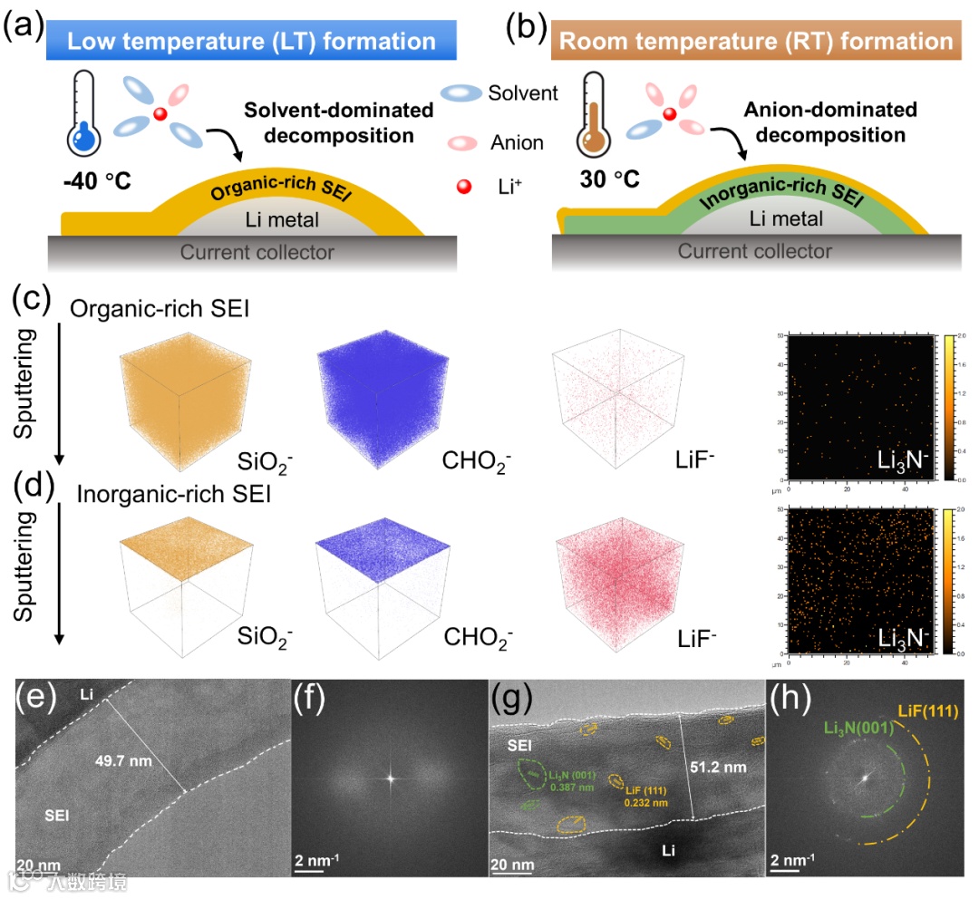 为了实现溶剂衍生的富有机SEI和阴离子衍生的富无机SEI的定向构建,我们采用了一种通用的方法,即通过调整化成过程的温度(图2a,b)。随着温度的降低,更多的溶剂分子参与了Li+的初级溶剂化鞘层,表明其具有更强的离子-偶极相互作用。这种溶剂化结构由于具有更多的溶剂配位导致形成了富有机的SEI。相比之下,随着温度的升高,更多的阴离子参与了初级溶剂化鞘,形成阴离子衍生的富无机的SEI。为了验证化成温度控制的对SEI的实际影响,通过冷冻透射电镜研究了SEI的纳米结构和组成。由低温或常温化成构建的SEI具有相似的厚度。如图2e,f所示,低温化成形成的SEI呈无定形的SEI形态。相比之下,由室温化成形成的SEI具有丰富的无机结构,由非晶态聚合物基质和富含高度有序晶体的嵌入纳米晶体组成(图2g,h)。利用飞行时间二次离子质谱仪(ToF-SIMS)的深度剖面和三维视图,进一步确定了SEI的精细组成和结构。SiO2-、CHO2-、LiF-和Li3N-分别是含硅有机组分、含碳有机组分、LiF和Li3N的特征离子碎片。如图2c所示,在低温化成条件下,大量的有机成分均匀地分散在整个SEI中,而LiF和Li3N的含量明显较少。相比之下,室温化成形成了一个双层SEI,表层为有机组分,内层为无机组分(图2d)。