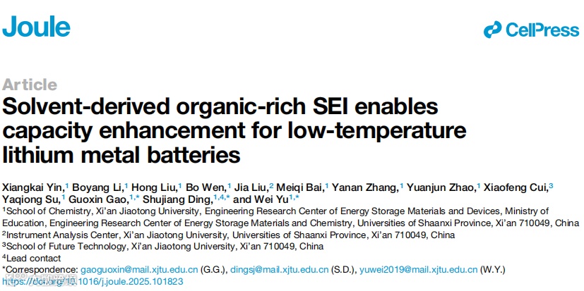 锂金属电池能量密度超过500 Wh kg-1,有望大幅度提高低温电池的能量密度。然而,未改性的锂金属电池在0 ℃以下性能迅速下降,-20 ℃左右失效,难以满足极端低温要求。为提升低温性能,研究者们开发了共溶剂法、弱溶剂化电解液(WSE)、锂盐设计、人工固态电解质界面(SEI)设计等策略。其中,WSE因弱Li+-溶剂相互作用和富阴离子溶剂化结构,被认为是低温下最有效的设计。尽管WSE已实现锂金属电池低温正常运行,但仍然面临容量严重衰减的问题。这主要源于温度降低时电池阻抗的指数级增长。SEI的组成是影响电池阻抗的重要原因之一。低温锂金属电池中的SEI设计常常模仿室温下的富无机化设计。富无机SEI虽具有稳定性高、离子传输均匀和枝晶抑制能力强等优点,但其高极性有可能吸引更多溶剂,增加Li+-溶剂配位,抑制去溶剂化过程。相比之下,有机成分因其弱极性可避免吸引溶剂,维持WSE的富阴离子溶剂化结构。并且有机SEI中离子传导遵循孔隙扩散机制,理论上具有更高的SEI离子导电性,可降低SEI内离子传输阻抗。因此,富有机SEI有可能成为提升低温锂金属电池容量的新途径。