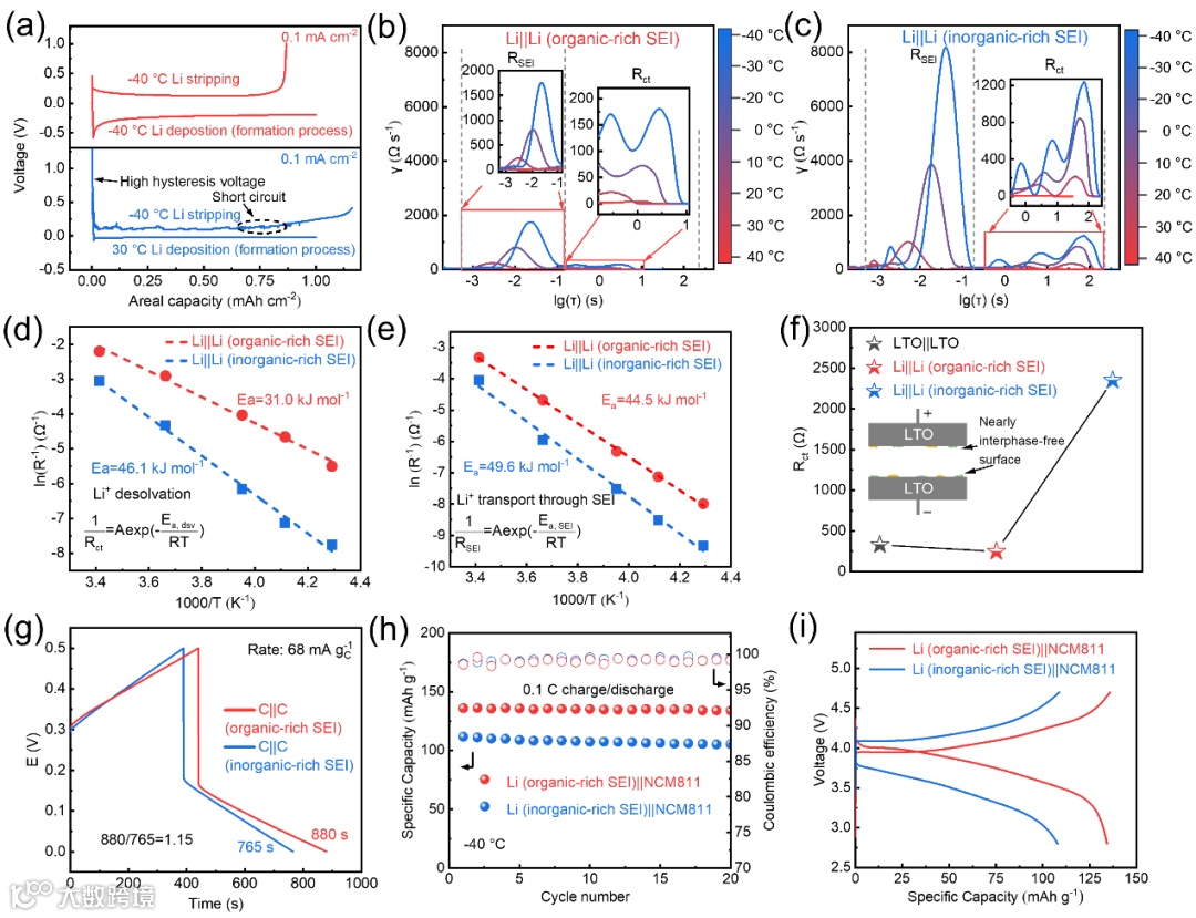 图4. 在不同SEI条件下的电化学动力学表现。(a)匹配富无机SEI和富有机SEI的非对称电池的充放电曲线。(b)Li||Li (富有机SEI)和(c)Li||Li (富无机SEI)的变温DRT分析结果。匹配富无机SEI和富有机SEI的(d)锂离子去溶剂化能和(e)锂离子穿越SEI活化能。(f)LTO||LTO、Li||Li (富有机SEI)和Li||Li (富无机SEI)的Rct对比。(g)匹配不同SEI的C||C电容器的充放电曲线。(h)Li (富无机SEI)||NCM811电池和Li (富有机SEI)||NCM811电池的循环性能对比。(i)相应的充放电曲线。