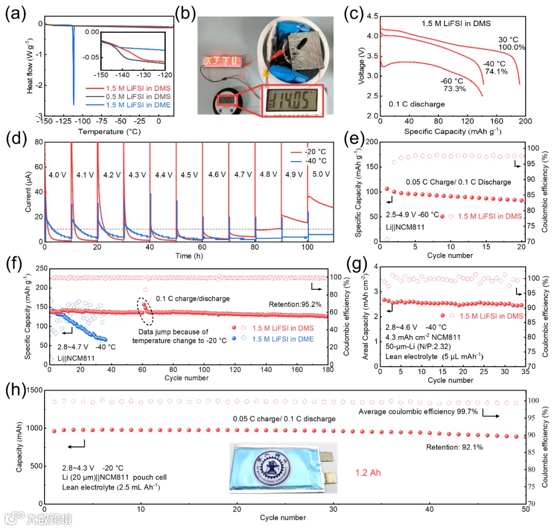 图5. 低温条件下的Li||NCM811电池的电化学性能对比。(a)DMS基电解液和DME基电解液的差示扫描量热分析(DSC)测试结果。(b)Li||NCM811软包电池在-114.05 ℃下给LED灯供电的照片。(c)在不同温度下匹配DMS基电解液的Li||NCM811电池的放电曲线。(d)漏电流测试。(e)在-60 ℃下匹配DMS基电解液的Li||NCM811电池的循环性能。(f)在-40 ℃下匹配DMS基电解液和DME基电解液的Li||NCM811电池的循环性能。(g)在苛刻条件下的匹配DMS基电解液的Li||NCM811电池的循环性能。(h)匹配DMS基电解液的1.2 Ah的Li||NCM811软包电池的循环性能。