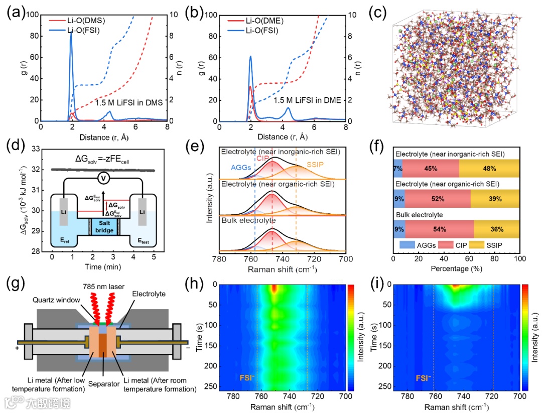 图3. 近界面处和体相电解液的溶剂化结构。(a)DMS基电解液和(b)DME基电解液的RDF和n(r)。相应的DMS基电解液的MD模拟快照。(d)测试的DMS基电解液和DME基电解液的相对溶剂化能。(e)体相电解液、富有机SEI界面处电解液、富无机SEI界面处电解液的拉曼光谱。(f)统计的聚集体(AGGs)、接触离子对(CIP)和溶剂分离离子对(SSIP)的相对比例。(g)原位拉曼装置示意图。(h)匹配富有机SEI和(i)富无机SEI的近界面电解液的原位拉曼图谱。
