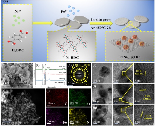 图1. (a) FeNi3-x@OC合成示意图。(b) 2D Ni-BDC的SEM图像。(c) FeNi3-x@OC的XRD图。(d) FeNi2.25@OC的SAED图。(e-g) (e) FeNi1.5@OC、(f) FeNi2.25@OC和 (g) FeNi3@OC的HRTEM图像。(h) FeNi2.25@OC的TEM图像和 (f) EDS元素映射图像 (C、O、Fe、Ni)。
