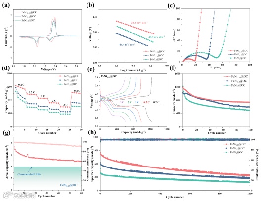图5. 基于不同隔膜的Li-S电池的电化学性能。(a) 基于不同隔膜的 Li-S 电池在0.1 mV s-1时的 CV 曲线。(b) 与CV曲线相对应的Tafel图。(c) 采用不同隔膜的Li-S电池的Nyquist图。(d) 三种改性隔膜在不同电流密度下的倍率性能。(e) 采用FeNi2.25@OC改性隔膜的Li-S电池在不同倍率下的恒流充放电曲线。(f) 0.2 C下的循环性能。(g) 高硫负载下的FeNi2.25@OC电池在0.2 C时的循环性能。(h) 采用不同隔膜的Li-S电池在1 C下的长期循环性能。