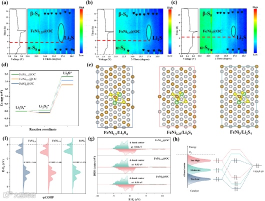 图4. LiPSs催化转化的理论分析。(a-c) (a) FeNi2.25@OC、(b) FeNi1.5@OC和 (c) FeNi3@OC改性隔膜的原位XRD表征。(d) FeNi1.5@OC、FeNi2.25@OC和FeNi3@OC的吉布斯自由能曲线。(e) FeNi1.5@OC、FeNi2.25@OC和FeNi3@OC上Li2S4的优化配置。(f) 吸附在FeNi1.5@OC、FeNi2.25@OC和FeNi3@OC上的Li2S4末端S-S键的pCOHP。(g) FeNi1.5@OC、FeNi2.25@OC和FeNi3@OC的d轨道态密度。(h)Li2S2/Li2S与具有不同d带中心的催化剂之间的轨道相互作用。