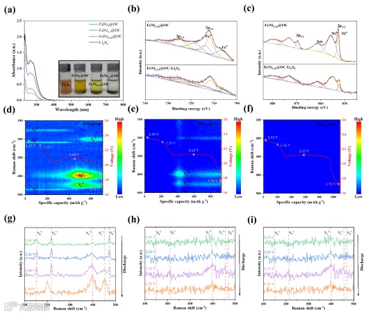 图3. 吸附性能测试和原位表征。(a) 不同材料对Li2S6进行可视化吸附测试的光学照片及12小时后上清液的紫外可见光谱。(b) FeNi2.25@OC吸附Li2S6前后的Fe 2p XPS光谱。(c) FeNi2.25@OC吸附Li2S6前后的Ni 2p XPS光谱。(d-f) 使用FeNi3@OC、FeNi1.5@OC和FeNi2.25@OC改性隔膜在放电过程中的原位拉曼光谱。红色曲线代表放电过程。(g-i) 基于FeNi3@OC、FeNi1.5@OC和FeNi2.25@OC改性隔膜的Li-S电池的选定拉曼光谱。