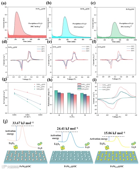 图 2. 电催化剂的电化学表征:(a-c) (a) FeNi2.25@OC、(b) FeNi1.5@OC和 (c) FeNi3@OC Li2S成核测试曲线(浅色和深色分别表示Li2S的成核和Li2S8/Li2S6的还原)。(d-f) 在不同温度下 (d) FeNi2.25@OC、(e) FeNi1.5@OC和 (f) FeNi3@OC的CV曲线。(g) 使用FeNi1.5@OC、FeNi2.25@OC和FeNi3@OC隔膜的Li-S电池中Li2S4转化率与温度的关系。(h) 2 V左右的还原峰及其对应的氧化峰的极化电压间隙。(i) 对称电池的CV曲线。(j) 以FeNi1.5@OC、FeNi2.25@OC和FeNi3@OC为催化剂时Li2S成核活化能变化示意图。