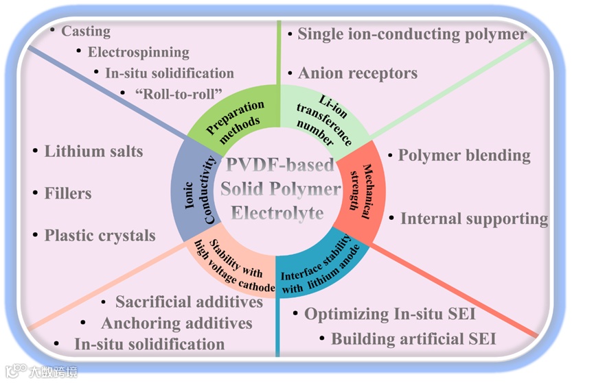 图1. PVDF基聚合物固态电解质关键性能提升策略示意图。