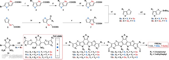 为了获得硒原子位置异构化的稠环电子受体,作者首先设计并合成了两个新型2-丁基辛基(BO)取代的噻吩并硒吩砌块(9a-b),进一步通过一锅法的Stille交叉偶联反应得到三个关键中间体(11a-c),最后获得三个分别具有双重分子内S‧‧‧O,S‧‧‧O+Se‧‧‧O,和双重Se‧‧‧O非共价相互作用的新型稠环电子受体(Y-SS,Y-SSe和Y-SeSe)。