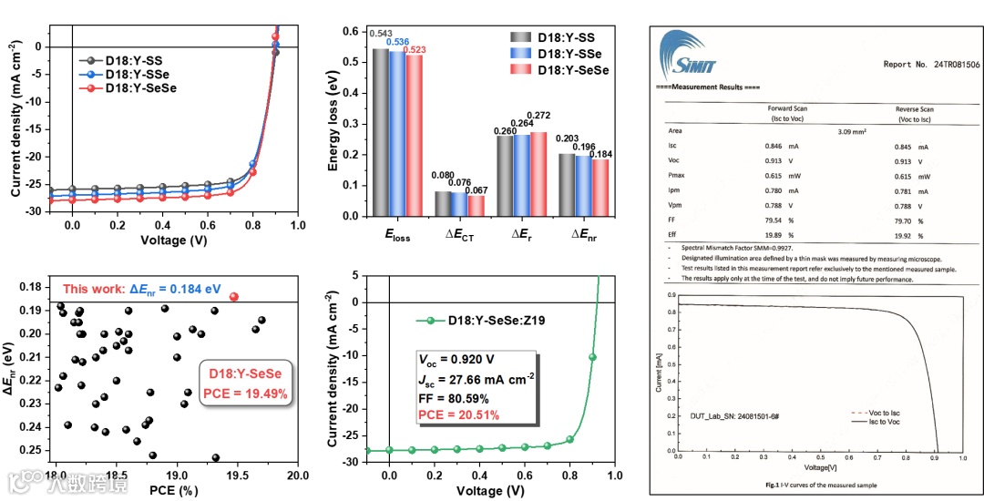 器件结果显示,具有双重分子内Se‧‧‧O非共价相互作用的Y-SeSe基二元器件获得了19.49%的PCE和极低的能量损失(0.184 eV),刷新了硒取代光伏材料的效率记录。此外,为了进一步探发掘Y-SeSe的潜力,作者制备的D18:Y-SeSe:Z19的三元共混器件实现了20.51%(SIMIT认证效率为19.92%)的能量转换效率,这是目前三元OSCs的最高效率。