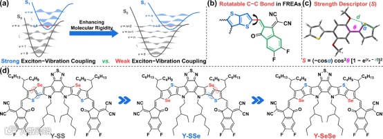 有机太阳能电池(OSCs)是一种面向国家“双碳”战略的新兴可再生能源技术,在光伏建筑和可穿戴设备等领域具有广阔的应用前景。但其能量转换效率(PCEs)仍然落后于硅和钙钛矿太阳能电池,这主要受限于较低的开路电压和较高的能量损失。根据能隙定律,目前高性能的稠环电子受体(FREAs)具有窄带隙和近红外吸收的特点,从而导致激发态到基态的振动弛豫加速(图1a)。这种强的电子-声子相互作用(即激子-振动耦合)会引起较大的非辐射复合损失,限制了OSCs效率进一步提升。