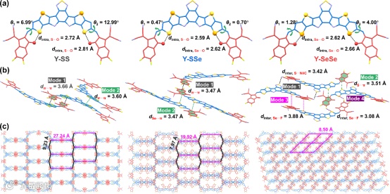 单晶XRD衍射分析结果表明,分子内S‧‧‧O 和Se‧‧‧O非共价相互作用都能够较好的保持稠环电子受体的共平面性,但引入更强的Se‧‧‧O NoCLs能够诱导多重分子间堆积模式,从而获得更加紧密的分子堆积,这有利于高效的电荷传输。