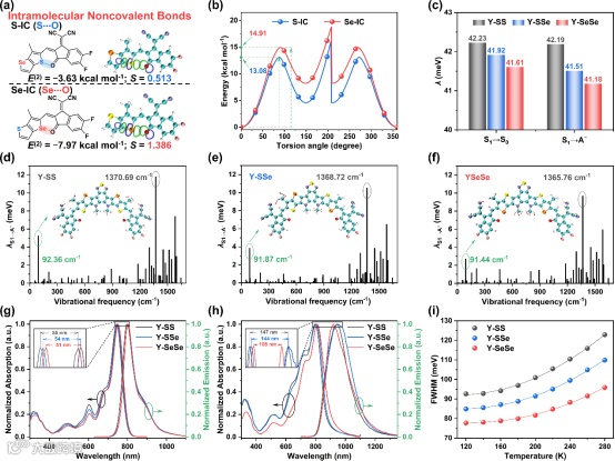 本工作基于增强稠环电子受体分子刚性从而降低激子-振动耦合的思路,通过硒原子位置异构化巧妙的实现了分子内Se‧‧‧O非共价相互作用的构建,设计并合成了三个新型稠环电子受体(图1d)。
