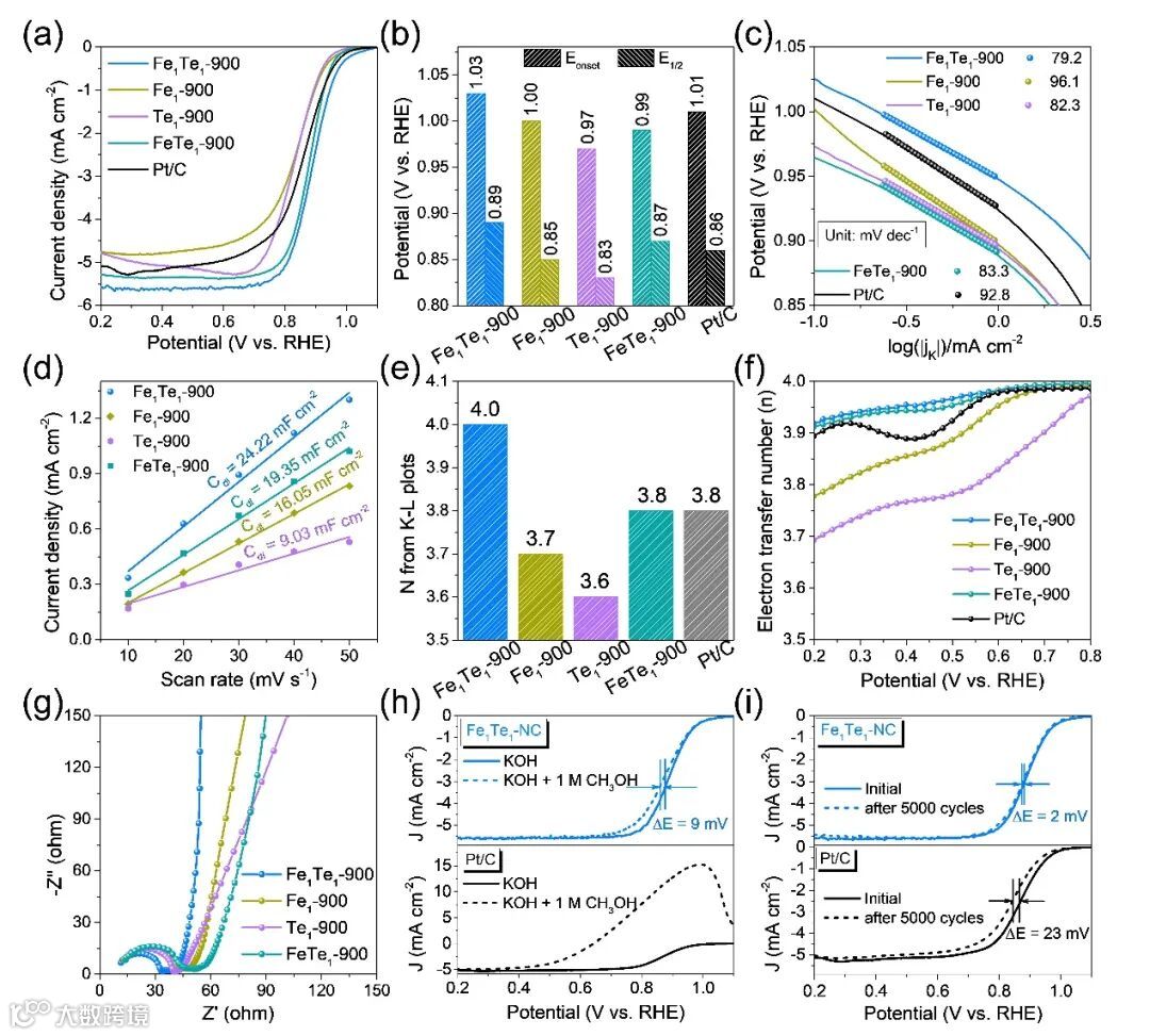 图5所示的电化学测试显示,Fe1Te1-900表现出优异的ORR性能(E1/2 = 0.89V,Eonset = 1.03 V),分析显示其优异的性能依赖于快速电子传递效率和较高的电化学比表面积。Fe1Te1-900的抗甲醇能力和稳定性均优于商业Pt/C催化剂,具有一定的应用潜力。
