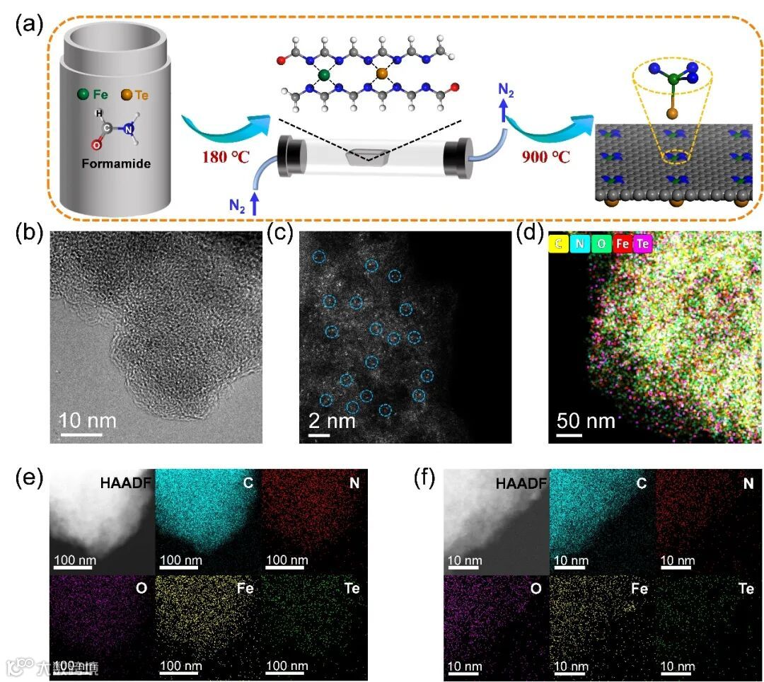 Fe1Te1-900的合成过程包括溶剂热反应和退火处理两个主要步骤(图2)。在初始步骤中,甲酰胺经过复杂的缩合过程,生成高N含量掺杂的碳质材料(聚氨基咪唑,PAI),能够促进Fe和Te的原子分散和稳定。随后的碳化过程使PAI链通过环状脱氢反应形成六元环结构,从而使高度分散的金属位点均匀分布在氮掺杂碳材料中。高分辨率透射电子显微镜观察结果显示,Fe1Te1-900中没有纳米颗粒或团簇,表明其金属成分的高度分散。同时,经球差校正的高角度环形暗场扫描透射电子显微镜(AC-HAADF-STEM)图像显示,分布在Fe1Te1-900黑色背景上的白点是具有高衍射的孤立金属原子。