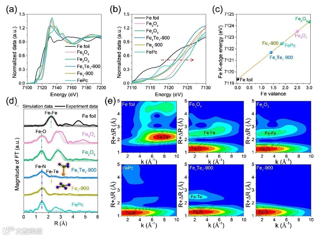 在WT-EXAFS的等高线图中,Fe1Te1-900在~3 Å-1处有两个峰,分别归因于Fe-N(O)和Fe-Te配位。因此,根据FT-和WT-EXAFS分析,可以认为Fe1Te1-900和Fe1-900中的Fe原子呈原子分散状态。同时,经过拟合程序确定了Fe1Te1-900的定量结构参数,Fe-N的配位数为2.8 ± 0.3,Fe-Te的配位数为1.2 ± 0.1。