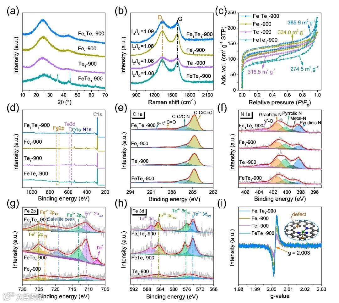 图3中,XRD、Raman、BET测试显示Fe1Te1-900属于经典的石墨化碳氮材料,具有较多的缺陷和丰富的多孔结构。通过XPS对催化剂进行元素分析,对C 1s、N 1s、Fe 2p和Te 3d元素含有的物种进行分类。EPR显示Fe1Te1-900在g值=2.003处的峰值相比其他催化剂显著增强,说明其存在更多的固有碳缺陷。