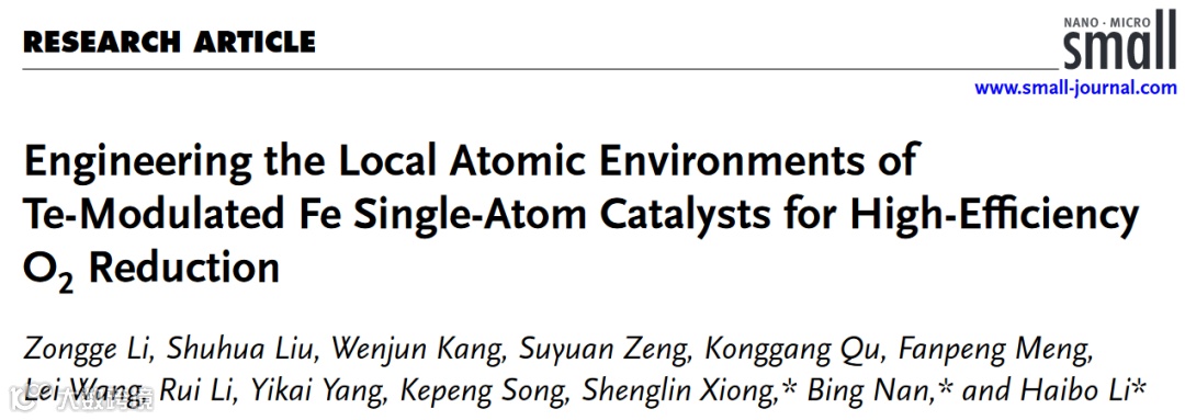 基于此,聊城大学的李海波教授与山东大学的熊胜林教授以及中国科学院上海高等研究院南兵工程师合作,在国际知名期刊Small上发表题为“Engineering the Local Atomic Environments of Te-Modulated Fe Single-Atom Catalysts for High-Efficiency O2 Reduction”的研究文章。该研究制备了一种Te修饰缺陷丰富的单原子FeNC材料,通过轴向配位的Te原子改善单原子Fe的局部电荷密度和能带结构,促进了氧中间体的催化转化,提升ORR催化效率。